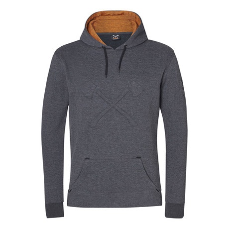 Doubleface-jersey, hettesnøring med lukkehylser av metall og kengurulomme. Hettegenseren har motiv av uthevede kryssede økser på brystet og merke på armen med teksten "STIHL TIMBERSPORTS® KISS MY AXE". Passer både til herre og dame.