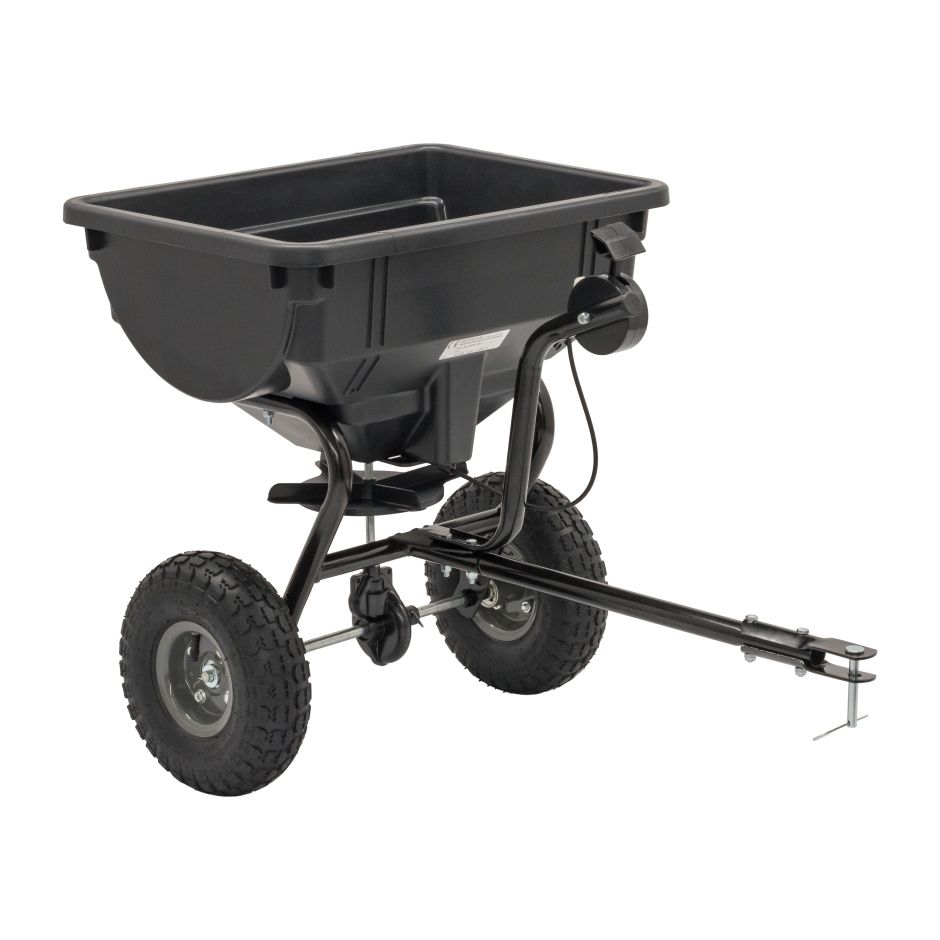 Frø- og gjødselspreder til bruk med hagetraktorer, inkludert modeller med frontklipp.