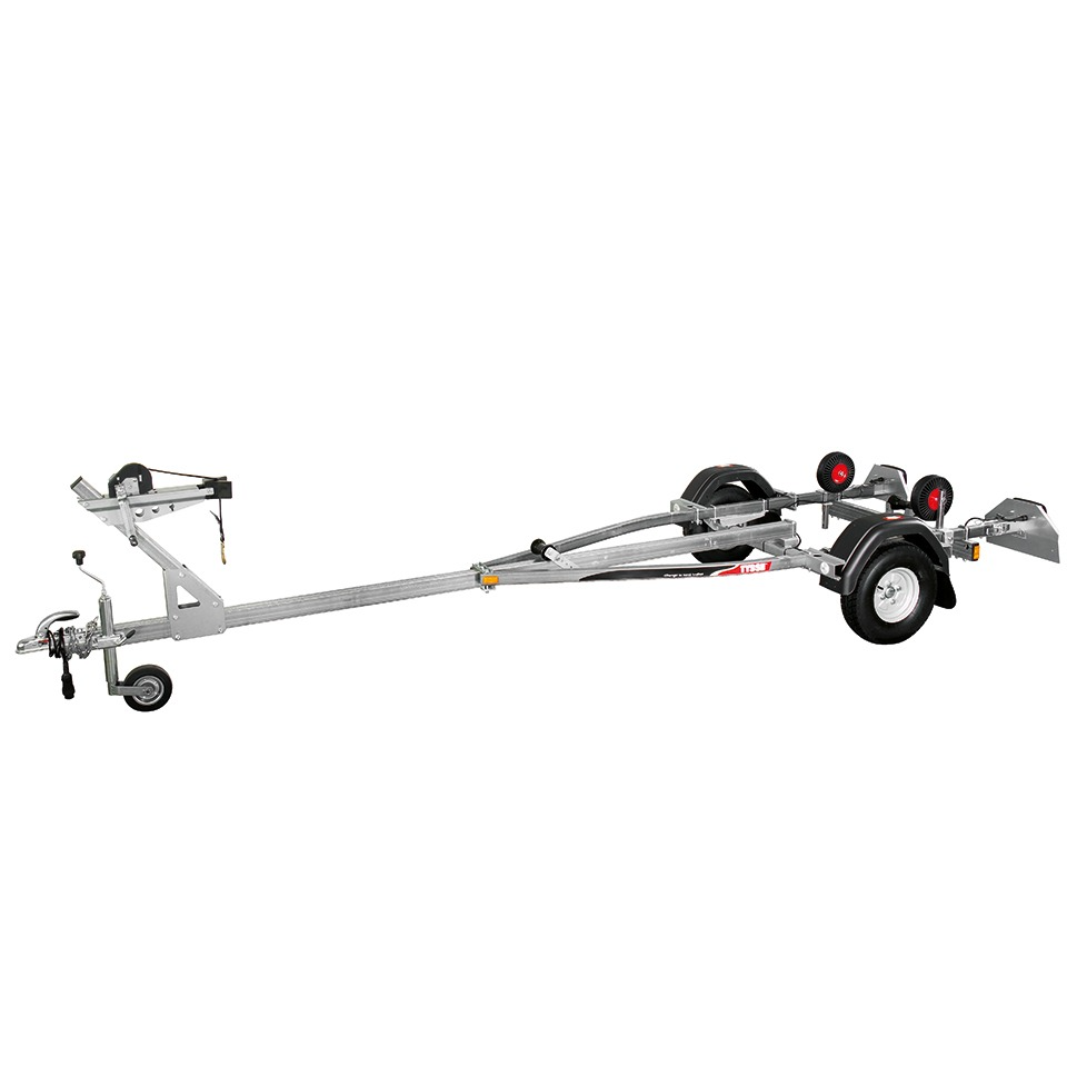 Regulerbar baugstøtte med v-blokk støtte mot baug. Kan justeres i flere posisjoner. Baugstøtten kan også justeres i lengderetning på båthenger. Leveres med Goliath vinsj som er utstyrt med et unikt sikkerhetssystem som gjør at båten holdes under forhaling og sjøsetting. Rask innrulling av bånd uten last. Leveres komplett med stroppebånd og krok.