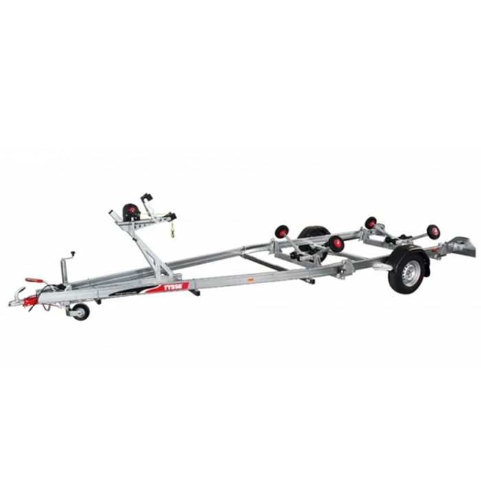 Regulerbar baugstøtte med v-blokk støtte mot baug. Kan justeres i flere posisjoner. Baugstøtten kan også justeres i lengderetning på båthenger. Leveres med Goliath vinsj som er utstyrt med et unikt sikkerhetssystem som gjør at båten holdes under forhaling og sjøsetting. Rask innrulling av bånd uten last. Leveres komplett med stroppebånd og krok.